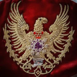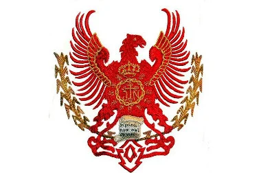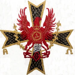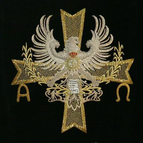El emblema se encuentra bordado en el estandarte de la agrupación, así como en el lado izquierdo de las capas de raso blanco de los penitentes del tercio que desfilan en la procesión del Sábado Santo.