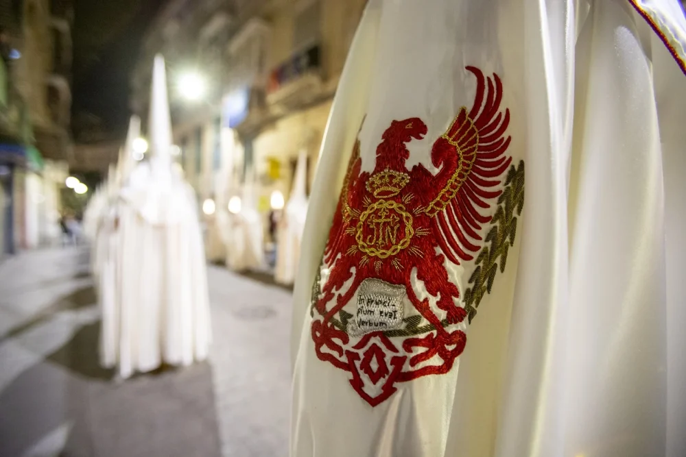 El emblema se encuentra bordado en los estandartes de la agrupación, en los fajines de los penitentes del tercio de la madrugada del Viernes Santo, así como en el lado izquierdo de las capas de raso blanco de los penitentes del tercio que desfilan en la procesión del Santo Entierro. Los portapasos del Viernes Madrugada llevan el emblema en el lado izquierdo de la túnica y los del Viernes Noche bordado en los fajines de raso blanco.