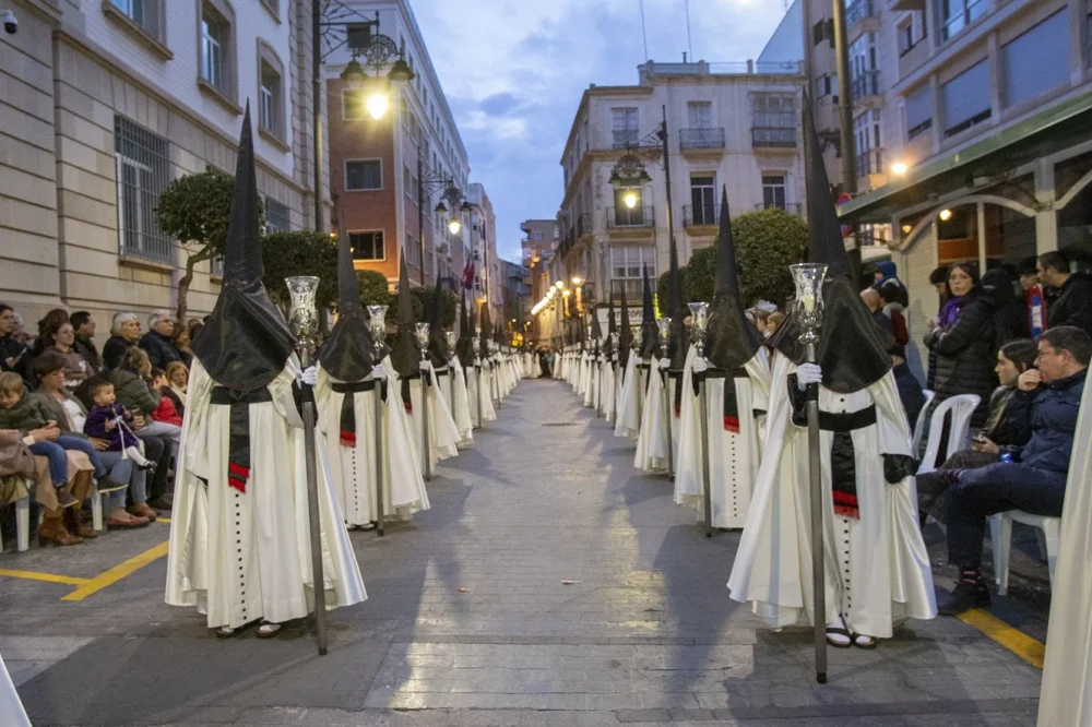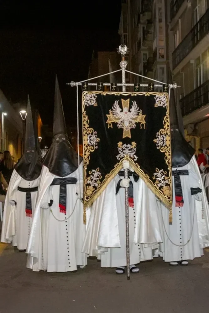 El tercio del Santo Amor de San Juan viste en la tarde del Sábado Santo túnica de lanilla blanca, capuz negro y capa de raso blanco bordada con el emblema de la agrupación flanqueado por una cruz de Malta y las letras griegas Alfa y Omega.