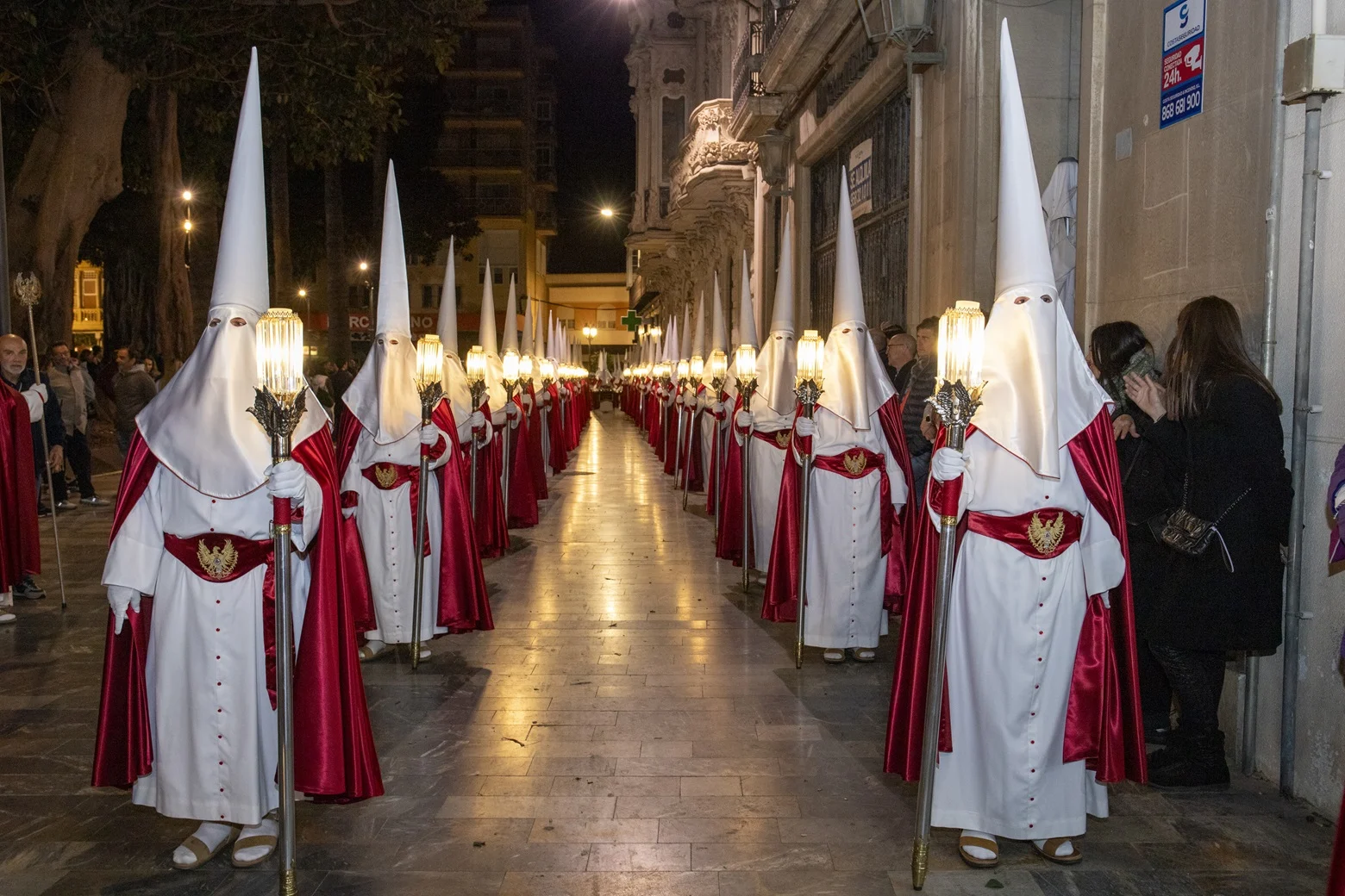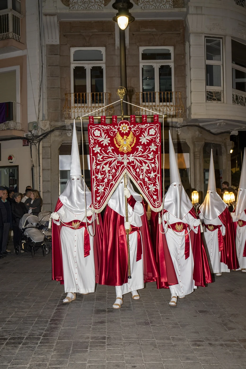 El tercio de San Juan viste en la madrugada de Viernes Santo su tradicional vestuario formado por túnica de lanilla blanca y capa roja de raso.