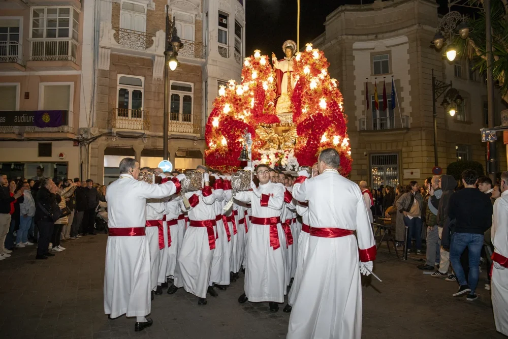 San Juan, junto con la Virgen Dolorosa, parten de madrugada desde Santa María de Gracia por las calles del Aire, San Miguel, Campos, plaza San Francisco, Arco de la Caridad, Caridad, Don Roque, hasta la plaza de la Merced donde se “encuentran” con el Nazareno, que a su vez salió de la Pescadería del marinero barrio de Santa Lucia, donde, según la leyenda, desembarcó Santiago para, desde aquí, expandir por toda Hispania la luz del Evangelio.