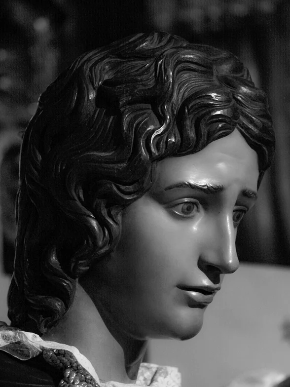Es posible contemplar en Capuz la misma actitud de serenidad en el rostro que Salzillo confirió al esculpir al escultura del discípulo amado, y unos mismos caracteres de paradigmática belleza que de siempre adornaban la representación de San Juan, no exentos de tintes apolíneos. Pero Capuz se apartó del modelo del gran imaginero murciano al acentuar los rasgos con perfiles geométricos dictados precisamente por las profundas raíces de su estilo que llegaban hasta la estatutaria del mundo griego. El magnífico tratamiento de la cabellera tallado con gran relieve, como si de un casquete se tratara, acentúa sus referencias con la escultura clásicas. La mirada penetrante, las cejas elevadas y el aire displicente lo concierten en una singular imagen procesional que alcanza en la calle su máxima expresión sentimental y estética.